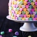 - Use a knife or a cake leveler to level out the cakes so that they are perfectly flat. Then add a thick and even layer of frosting on top of the first cake, and set the second cake on top. Continue to frost the entire cake with a very thin layer of frosting for the “crumb coat” (to seal in the crumbs). Then go back over the entire cake and frost with a thicker layer of frosting for the final coat. Layer with conversation hearts, beginning at the bottom and working your way to the top and center. (**You will want to work as quickly as possible so that the frosting stays moist for sticking.**)