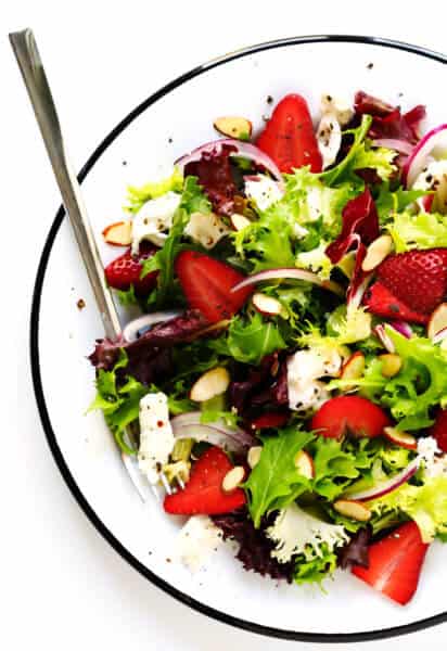 So if you’re interested in giving your strawberry salad a lift this year,ย bring home some fresh produce, blend up a quick batch of thisย 5-minute basil vinaigrette, and this gorgeous salad will be ready to serve in no time.