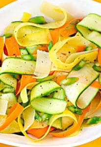 - Using a vegetable peeler or mandoline, shave the zucchini, squash, and carrots into long thin strips (“ribbons”). Thinly slice the asparagus on a diagonal.