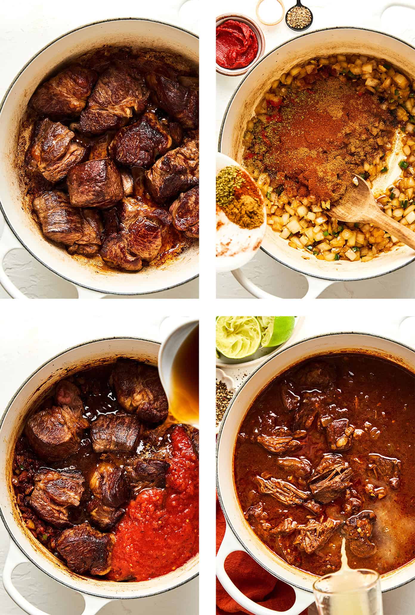 - Sear the beef. Heat the oil in a large Dutch oven over medium-high heat. Add the beef in batches, searing until browned on all sides. Transfer to a plate and set aside.