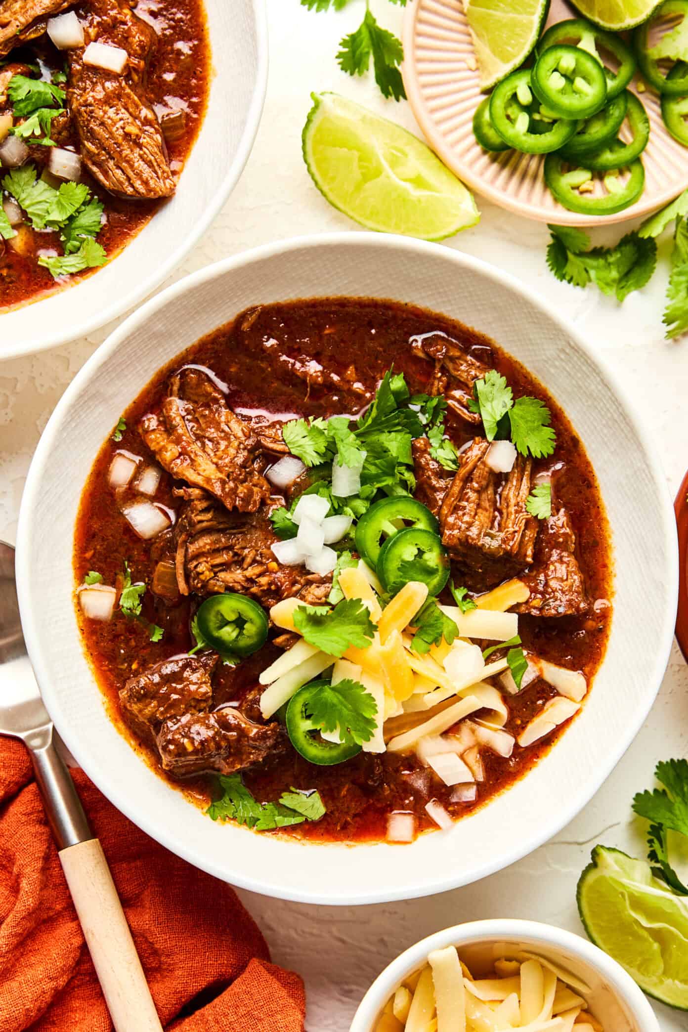 It’s the kind of chili that puts the beef front and center — big, tender chunks simmered low and slow in a boldly spiced tomato sauce, with zero beans in sight. (Texas-style!) Load it up with all of your favorite toppings and dive in with a spoon, or let your tortilla chips do the scooping!