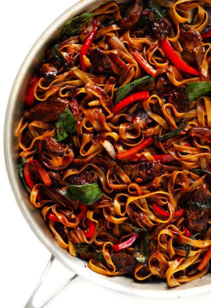 It’s basically a slightly-simpler version of my favorite drunken noodles recipe, made with lots of tender steak, al dente rice noodles, a few quick veggies, and a savory stir-fry sauce (featuring lots of Thai basil). And it absolutely hit the spot. It’s full of the bold savory flavors that I love in a good stir-fry. It’s easy to whip up in just 30 minutes or so. It’s easy to customize with whatever veggies and protein (such as chicken, pork, shrimp or crispy tofu) that you happen to have on hand. And I can vouch (ha, as the sole meat-eater in this house) that it also makes for fantastic leftovers.