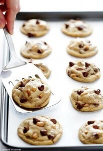 - Measure dough into rounded tablespoon-fulls, and roll into round balls. Place on a parchment-covered baking sheet, and dot with extra chocolate and toffee chips if desired. Repeat with remaining dough. Then transfer the cookie sheet to the freezer and chill for 5-10 minutes.