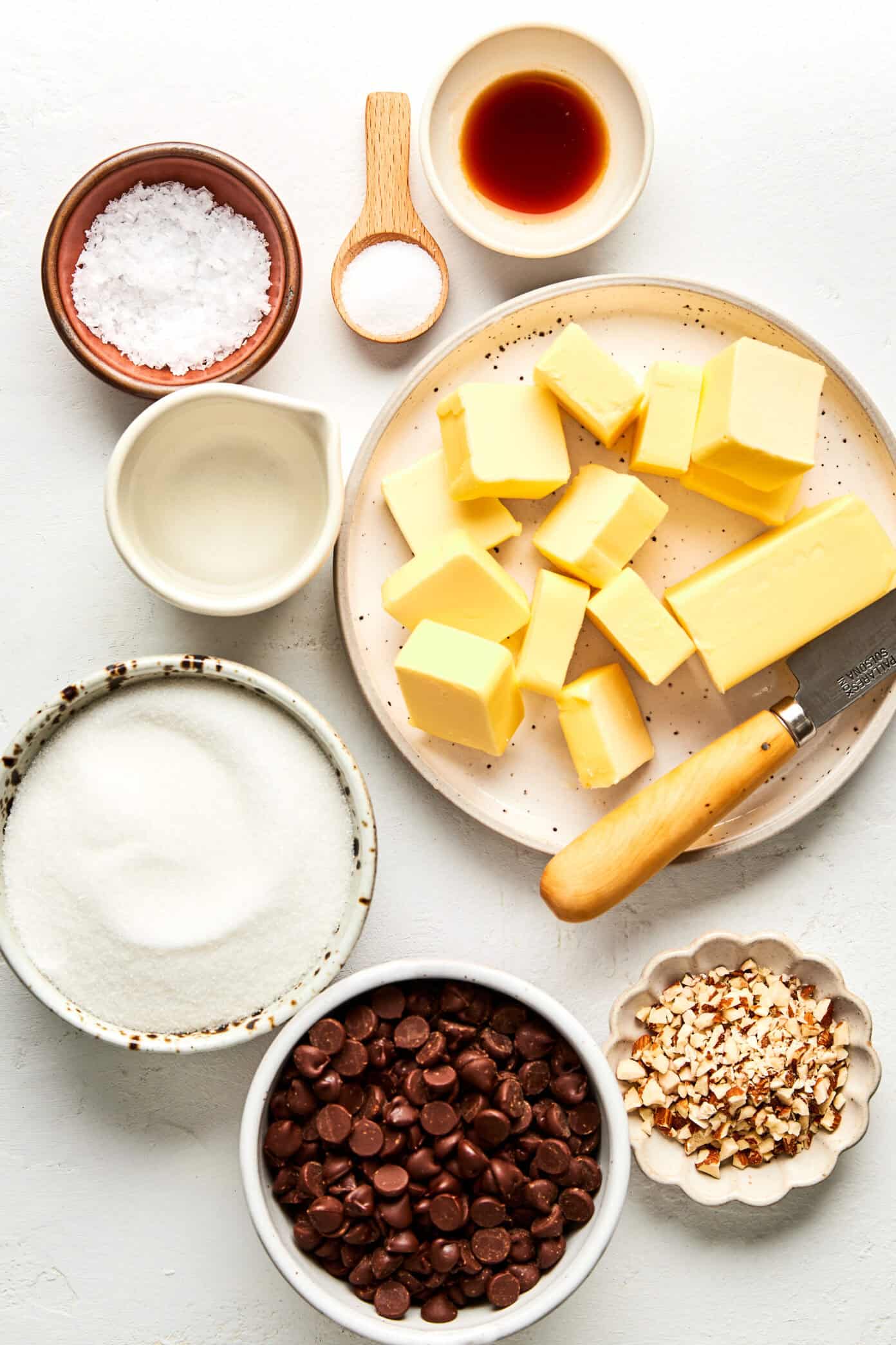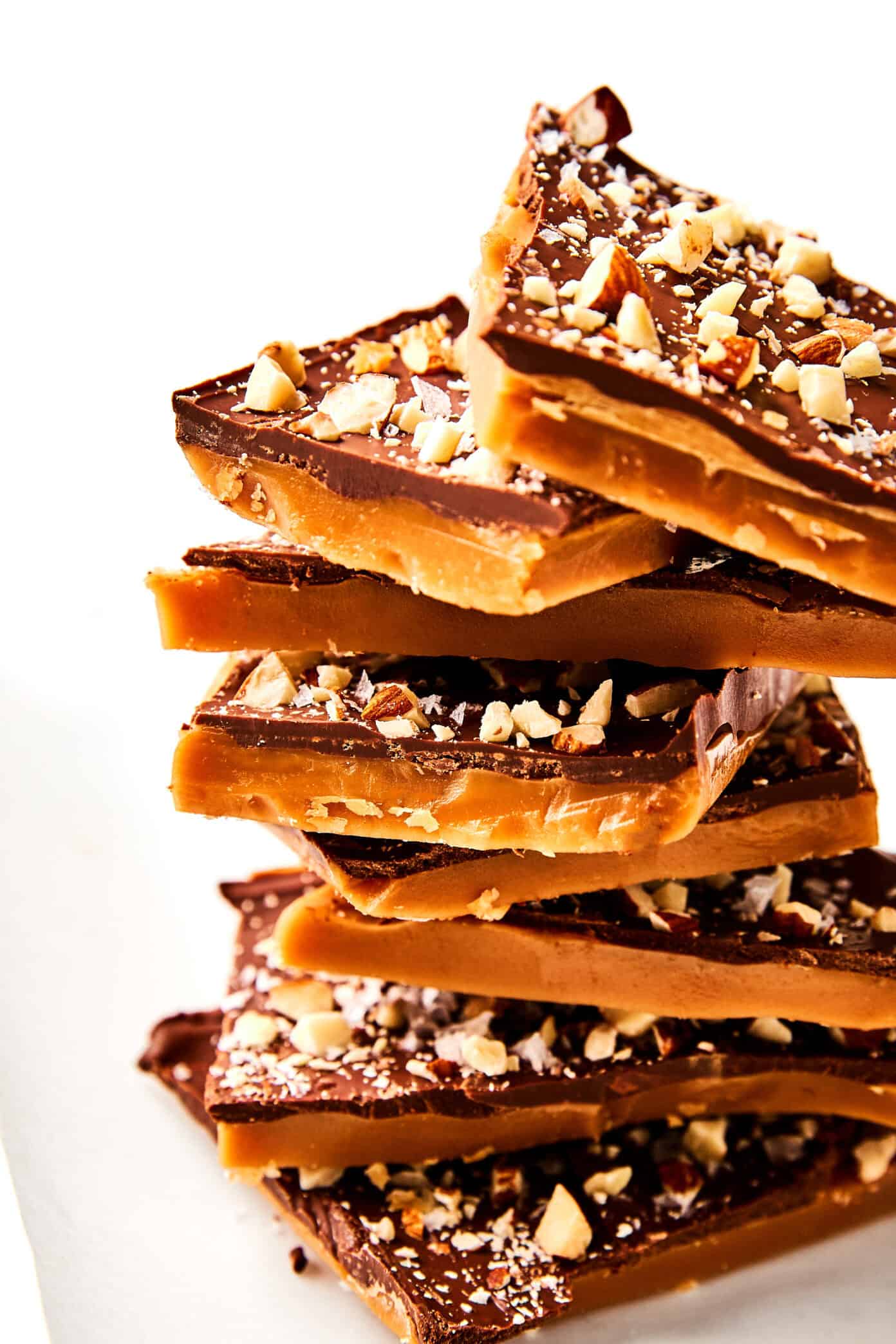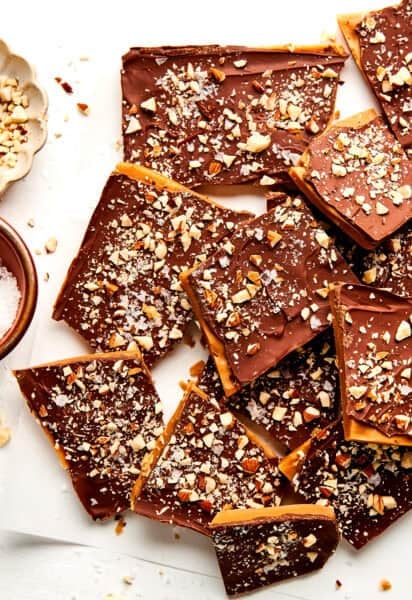 After making lots of toffee over the years, this is the recipe Iโve happily landed on as my personal favorite. It starts with a simple buttery toffee base, gets topped with chocolate chips that melt into a glossy layer, and finishes with a sprinkle of nuts (totally optional) and flaky sea salt. And I have to say โ one of my favorite things about this version is that it doesn’t stick to your teeth!