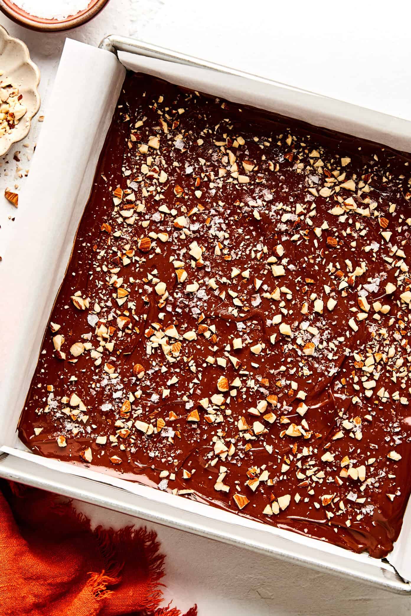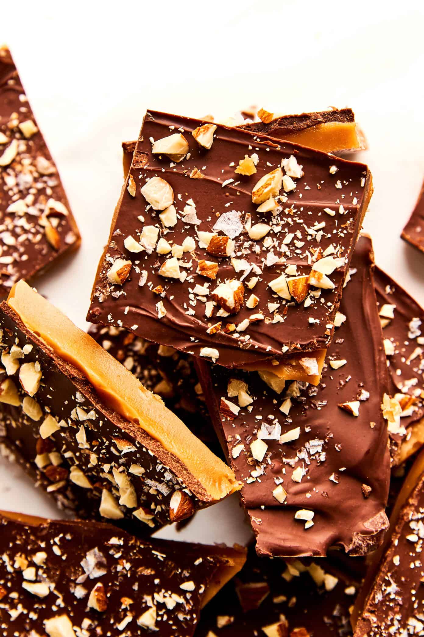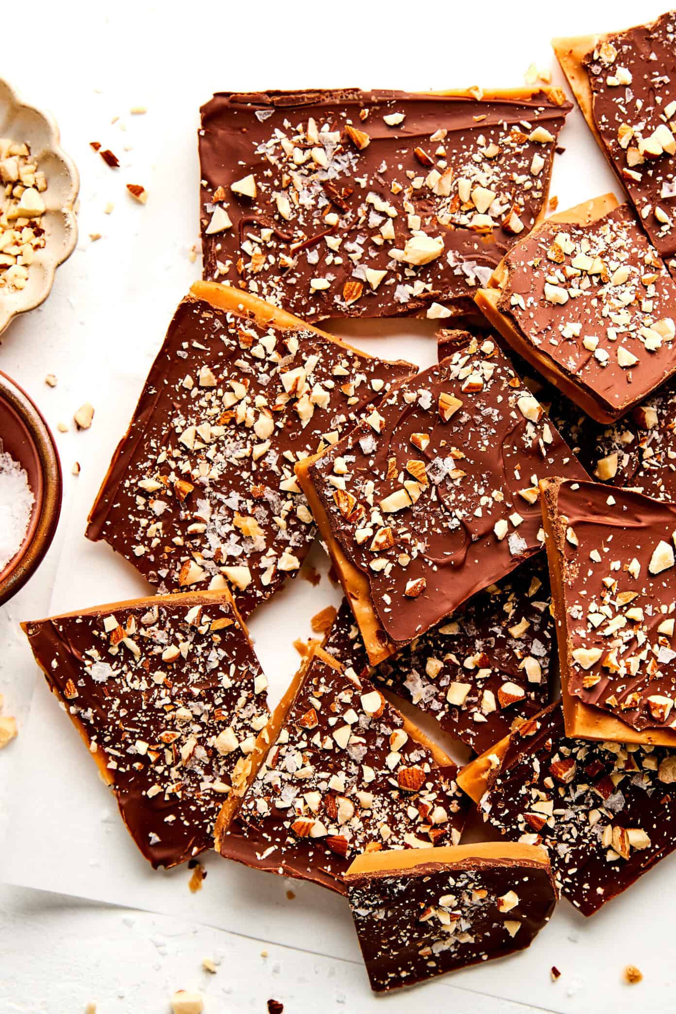 - Finish & cool. Sprinkle with chopped almonds and flaky sea salt, if desired. Let the toffee cool completely at room temperature until the chocolate is firm (you can refrigerate briefly to speed this up, but room temp gives the best snap). Once set, lift the toffee from the pan using the parchment overhang, break into pieces, and serve.
