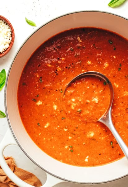 - Feta cheese: Crumbly, salty, creamy feta cheese perfectly complements the sweetness of the tomatoes. We’ll add the cheese in after the soup has been blended in order to enjoy the texture of the crumbled feta chunks.