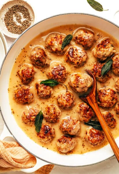 - Garnish and serve. If desired, fry a few sage leaves in a bit of butter or oil until crisp and use as garnish. Serve the meatballs hot over mashed potatoes, buttered noodles, or rice — spooning plenty of that rich gravy on top.