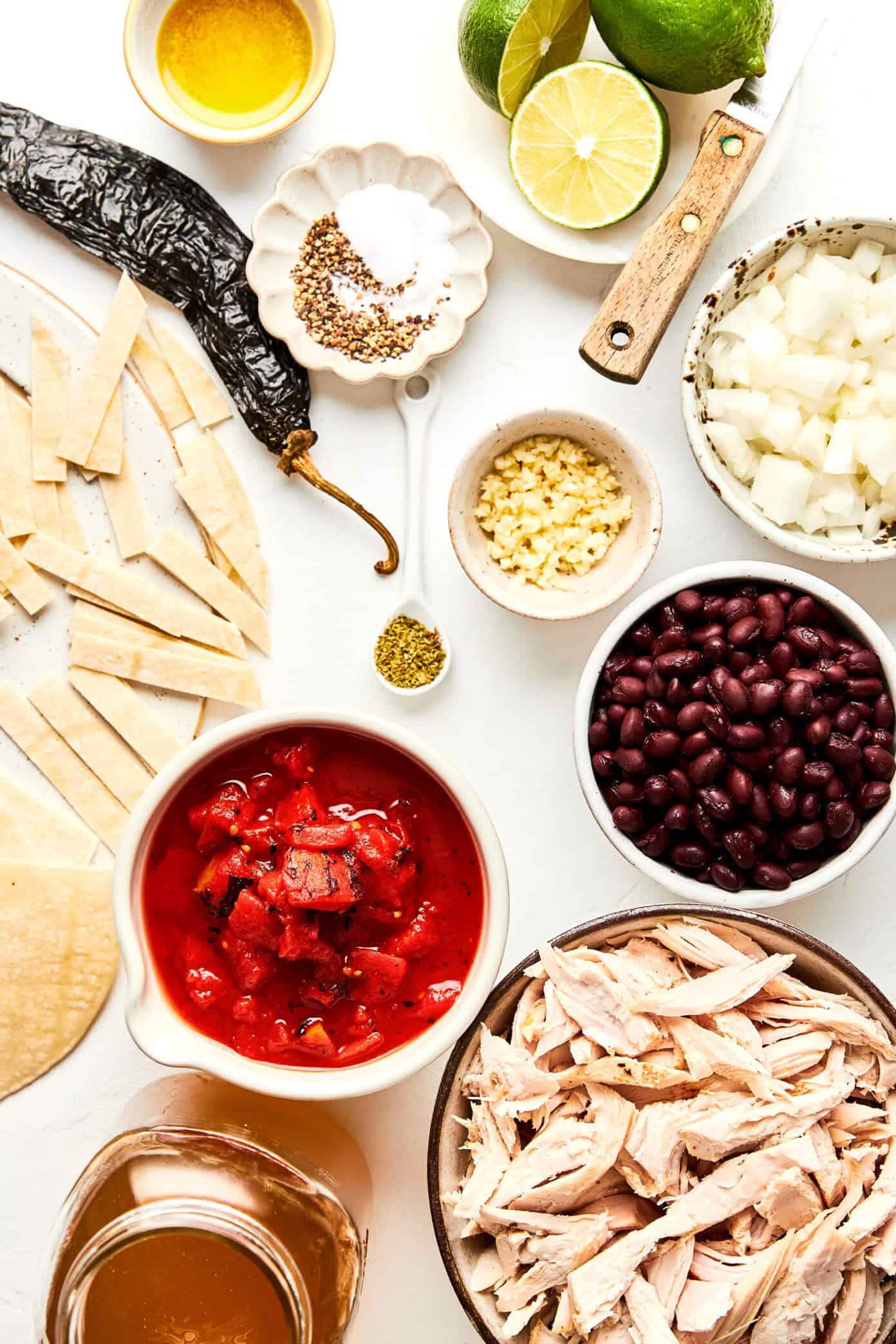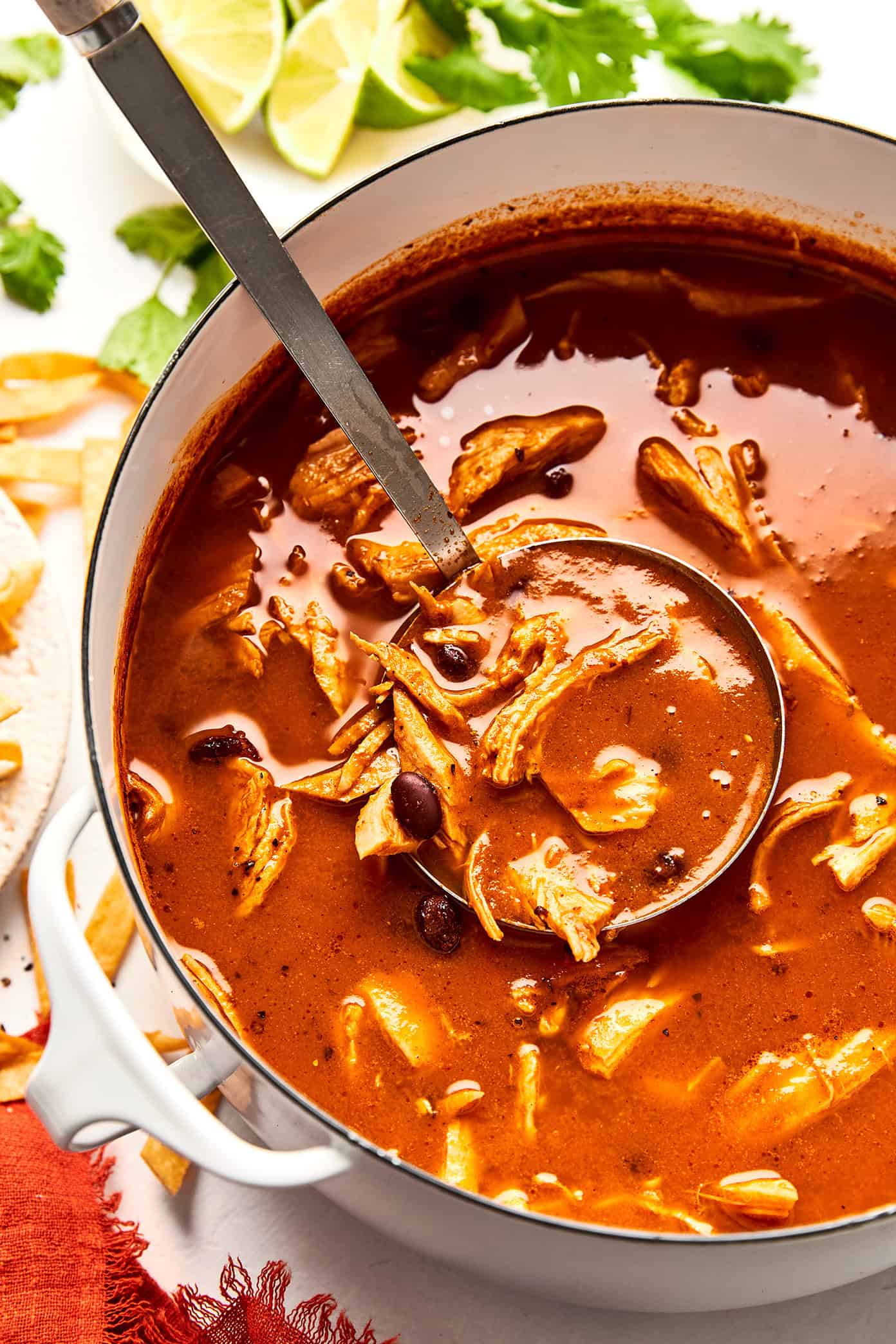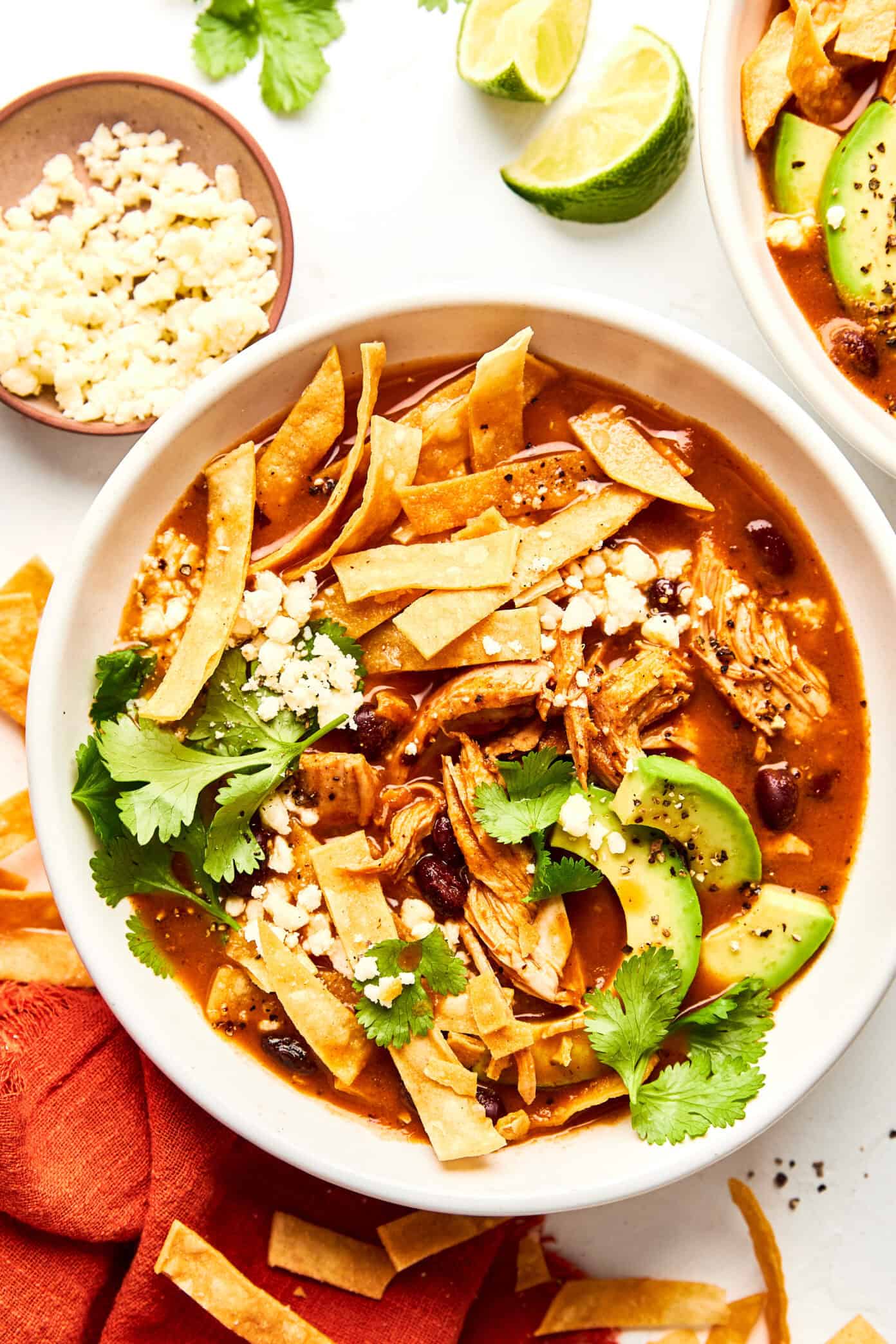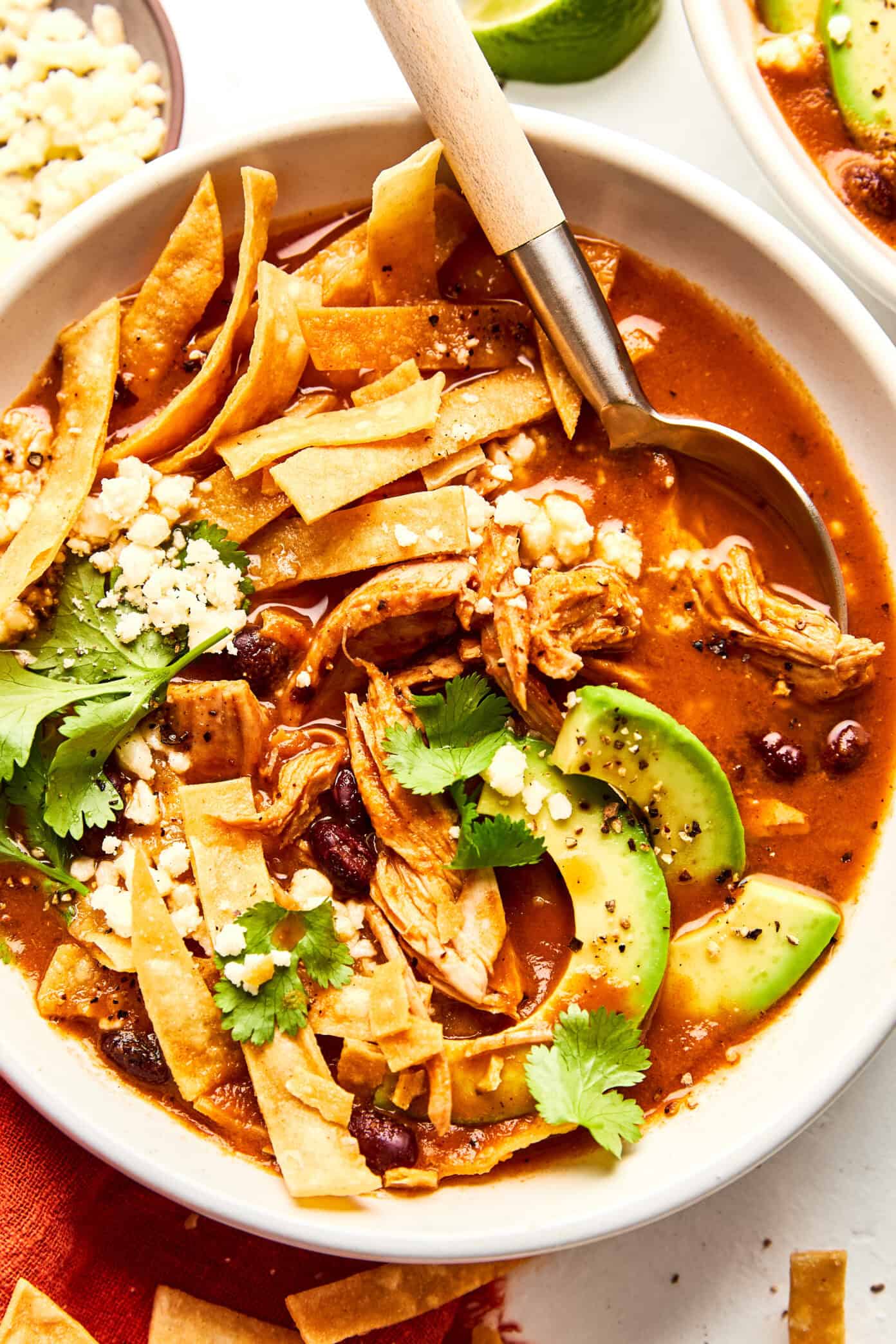 7. Serve. Ladle the hot soup into bowls over a handful of tortilla strips. Add any toppings you love — avocado, cheese, cilantro, extra lime — and enjoy right away!