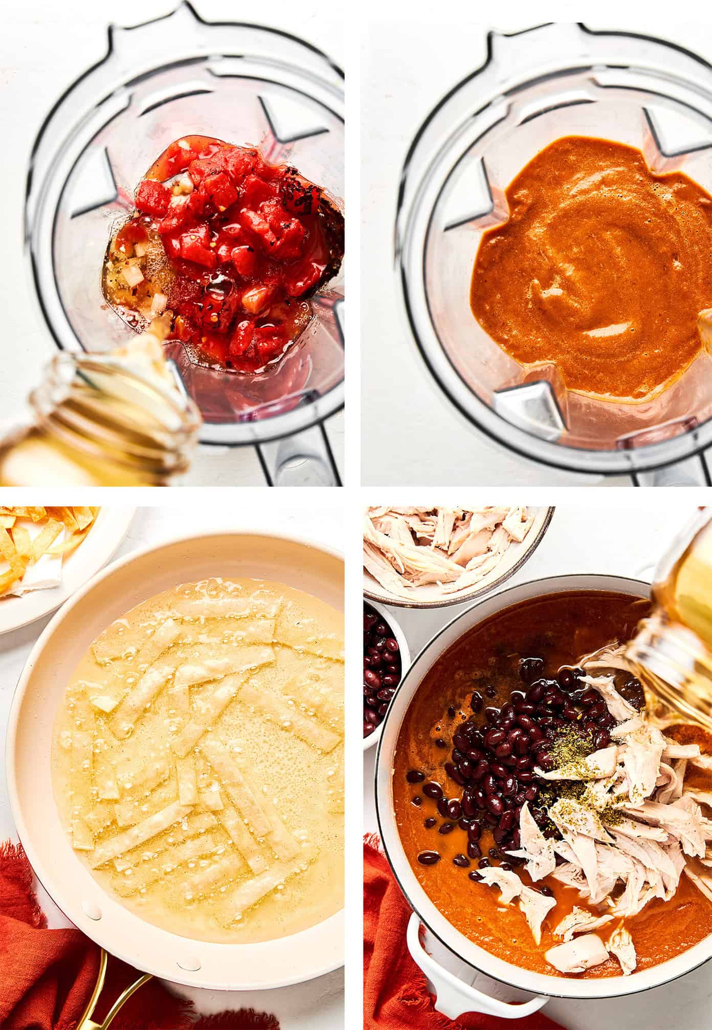 3. Blend the broth. Add the fire-roasted tomatoes to the blender along with about 1 cup of the stock (just enough to help the mixture purée easily). Blend until completely smooth and no large chile pieces remain.